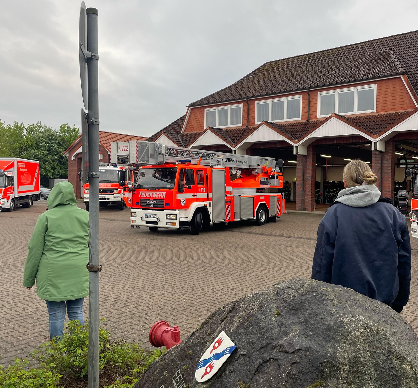 Nach einer Ersteinweisung in die Fahrzeugtechnik im Werk wurde die DLK nach Bönningstedt überführt und dort begrüßt.