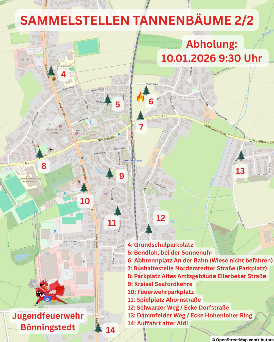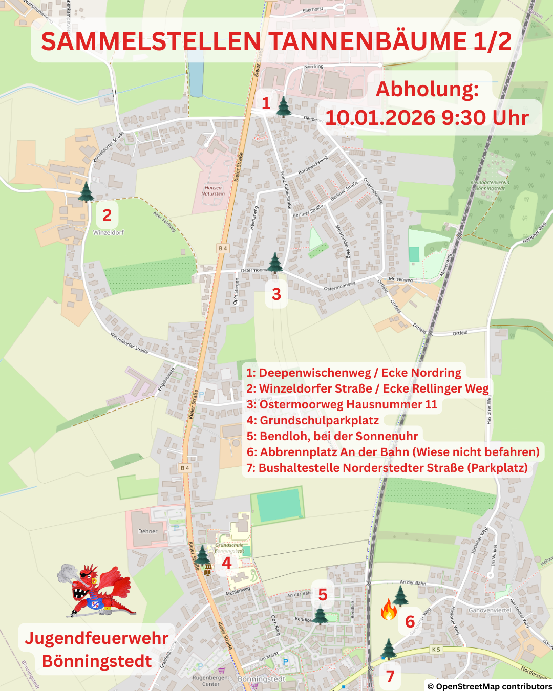 Auch in diesem Jahr sammelt die Jugendfeuerwehr wieder die Tannenbäume in Bönningstedt ein. Bitte stellt eure Bäume dafür abgeschmückt und gut sichtbar bis zum 10. Januar 2026 – 9:30Uhr an den Sammelpunkten ab.