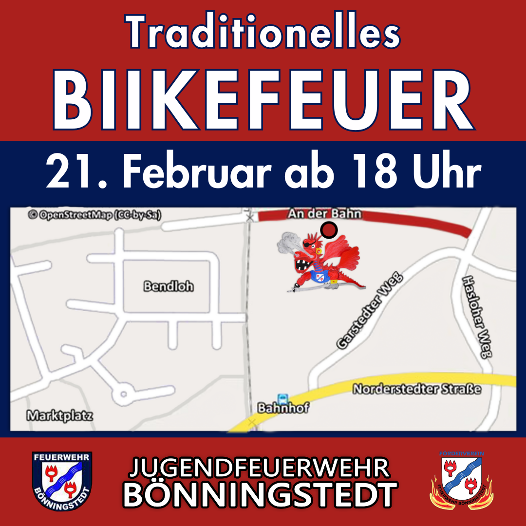 Die Jugendfeuerwehr Bönningstedt lädt wieder zum alljährlichen traditionellen Biikefeuer auf der Wiese an der Straße „An der Bahn“ ein.