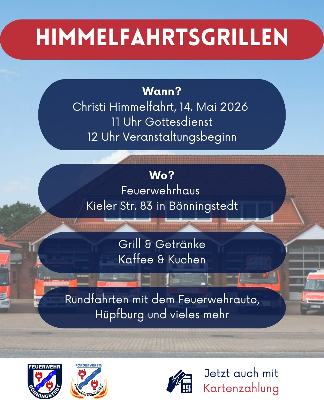 Auch in diesem Jahr veranstalten wir am 14. Mai wieder unser Himmelfahrtsgrillen am Feuerwehrhaus. Wir starten um 11 Uhr mit einem Gottesdienst der evangelischen Kirchengemeinde. Um 12 Uhr öffnen die Stände.